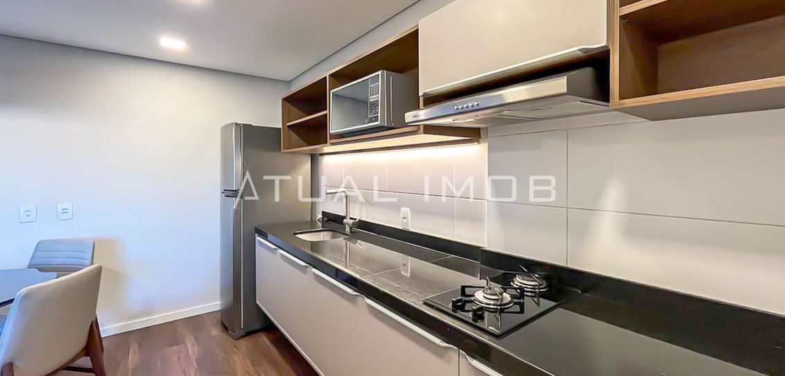 Living 2 ambientes com vista direta para o Parcão, cozinha americana equipada, 1 suíte com armário e também vista para o Parcão e amplo banheiro da suíte.